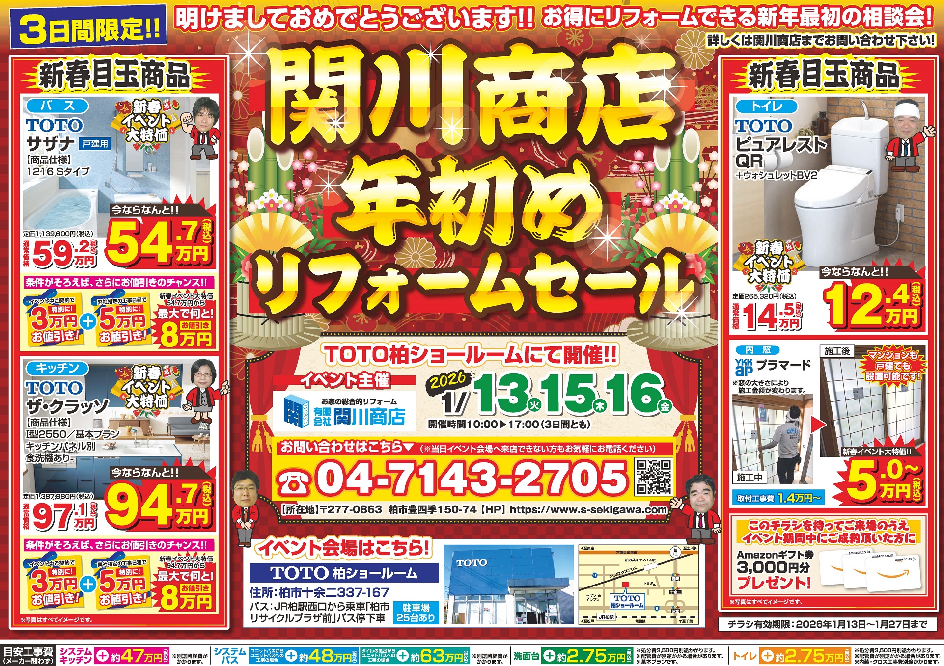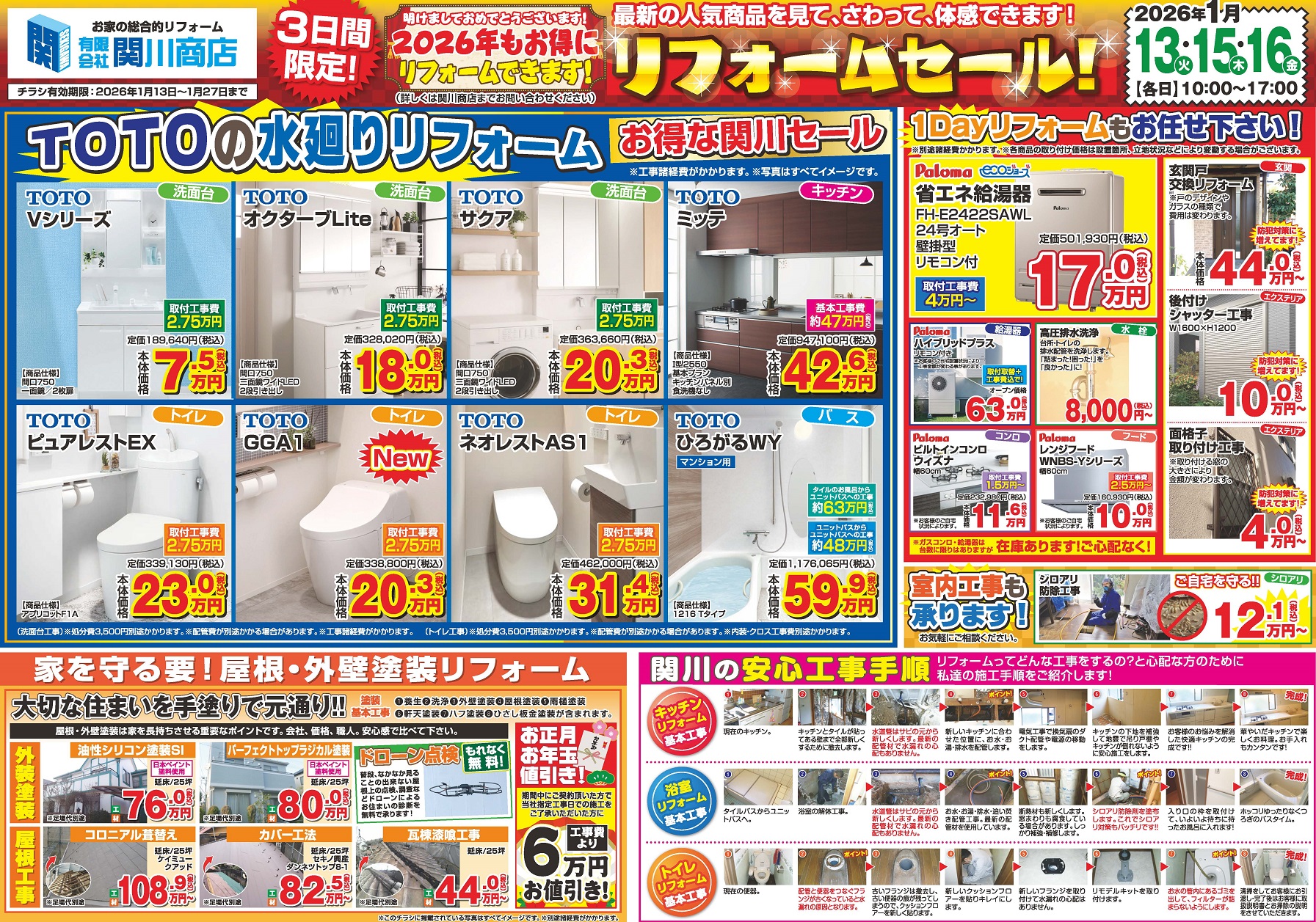 1/13・15・16限定「関川商店 年初めリフォームセール」開催! 2025.12.25 1/13(火)・15(木)・16(金)10:00~17:00に3日間限定の「関川商店 年初めリフォームセール」を下記のTOTOショールームにて開催いたします! 是非、お越しくださいませ。 ●TOTO柏ショールーム 住所:柏市十余二337-167 年末年始休暇のお知らせ 前の記事